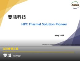 1雙鴻 2025Q1 營收年增 40%,毛利率 27.4%,EPS 5.66 元。水冷佔比增至 17%,全年目標 40-50%。泰國廠今年貢獻四成營收,看好 AI 伺服器液冷動能。