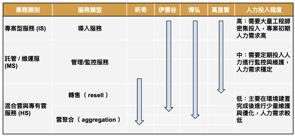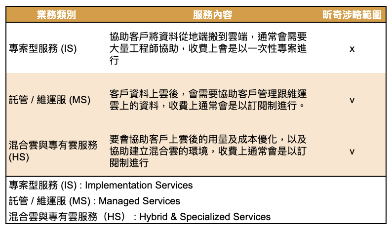 雲端服務商角色主要是協助雲端原廠供應商服務客戶,通常會分為 IS、MS 及 HS 三大業務: