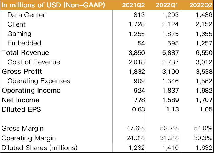 AMD 2022Q2 營收為 65.5 億美元(以下同),QoQ+11.3%、YoY+70.0%;毛利率 54.0%,QoQ+1.2ppts、YoY+6.4ppt,主因產品組合優化和本季完整將 Xilinx 併入財報所致。