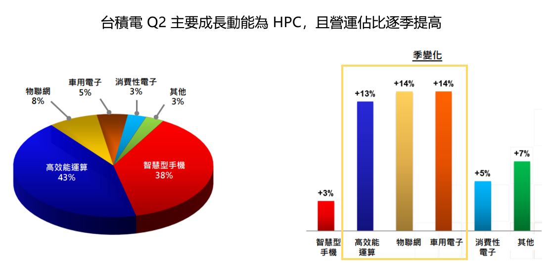 2. 以應用別來看,2022Q2 HPC 43%、智慧型手機 38%、IoT 8%、車用電子 5%、消費性電子 3%。