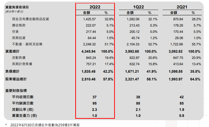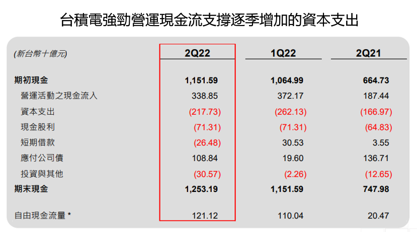 5. 2022Q2 營運現金流為 3,389 億元,Capex 為 2,177 億元,自由現金流為 1,211 億元,總現金儲備達 1.25 兆元,整體現金流及現金水位都很健康,足以支付逐年增加的資本支出。