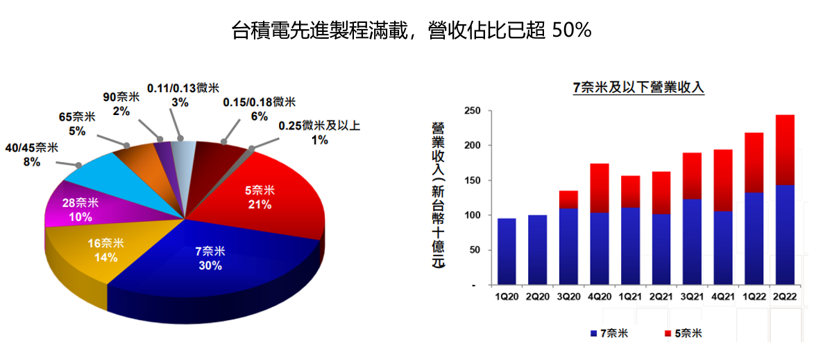 1. 台積電 2022Q2 營收佔比為 5nm 21%、7nm 30%、16nm 14%、28nm 及以上 35%,其中先進製程(7nm 以下)佔比為 51%。
