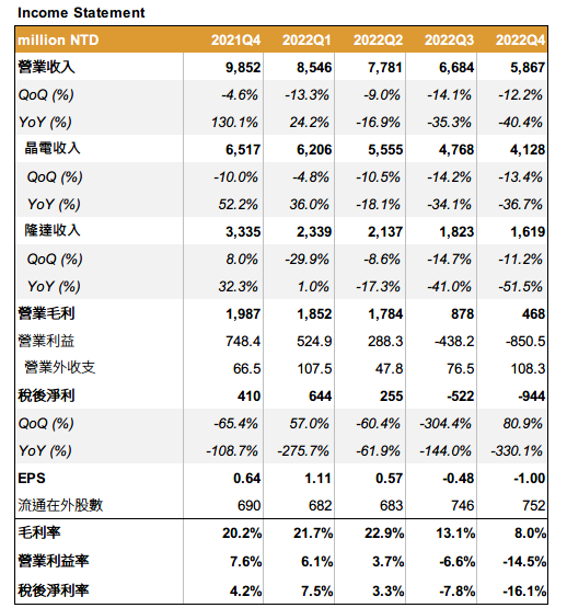 營收為 58.7 億元新台幣(以下同),QoQ-12.2%、YoY-40.4%(其中隆達年衰退比例較晶電大)。衰退主因大客戶蘋果 Mini LED 砍單、面板需求持續疲軟使全產線產能利用率降低(其中紅光產能利用率為 60%、藍光 40%、後段封裝 50~60%)。