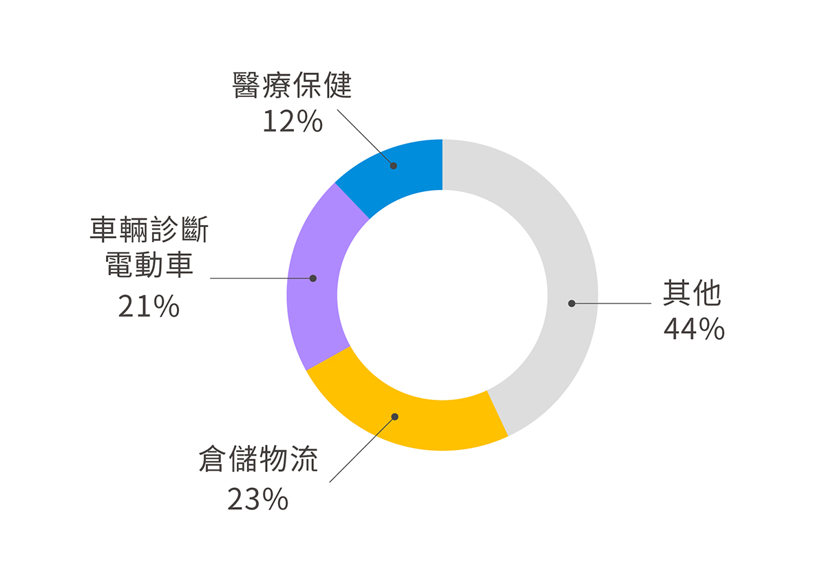 產品的應用領域主要為地面控制站、國防、工廠自動化等佔 44%、倉儲物流:23%、車輛診斷/電動車:21%、醫療保健:12%。
