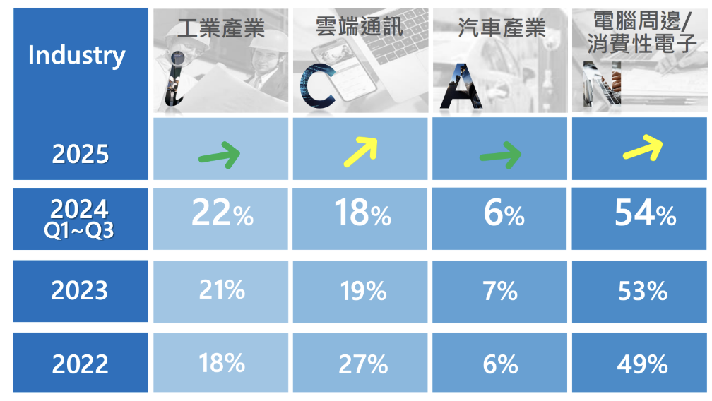 - 汽車電子發展:ADAS、智能座艙、車聯網應用持續擴大,未來將提升該領域佔比。