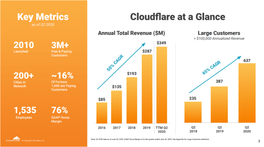 Cloudflare 成立於 2009 年,總部位於舊金山,主要 CDN 產品於 2010 年上線,於 2019 年 9 月 IPO,上市時估值約為美金 38 億元(以 IPO 承銷價每股美金 13 元計算),2020 年 7-8 月市值已經成長至 120 億元上下。