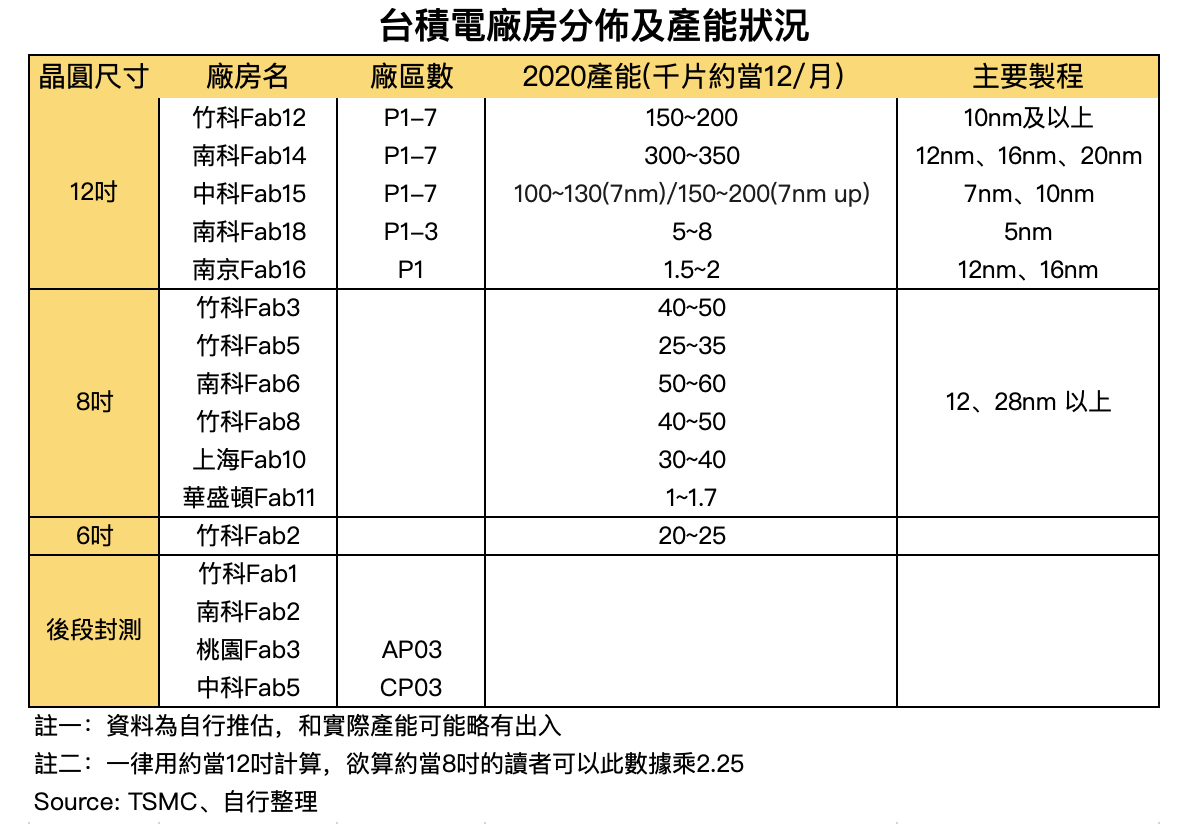 目前台積電的先進製程(7nm 以下)研發及製造都集中在 GigaFab,每年光 Fab12、Fab14 和 Fab15 三座 GigaFab 的年出貨量就佔整體 70% 以上(隨著 2020 年 Fab18 的投產,整體佔比還會更高),且由於都用 12 吋晶圓製造,近幾年台積電擴廠計畫都以 12 吋晶圓的 GigaFab 為主。
