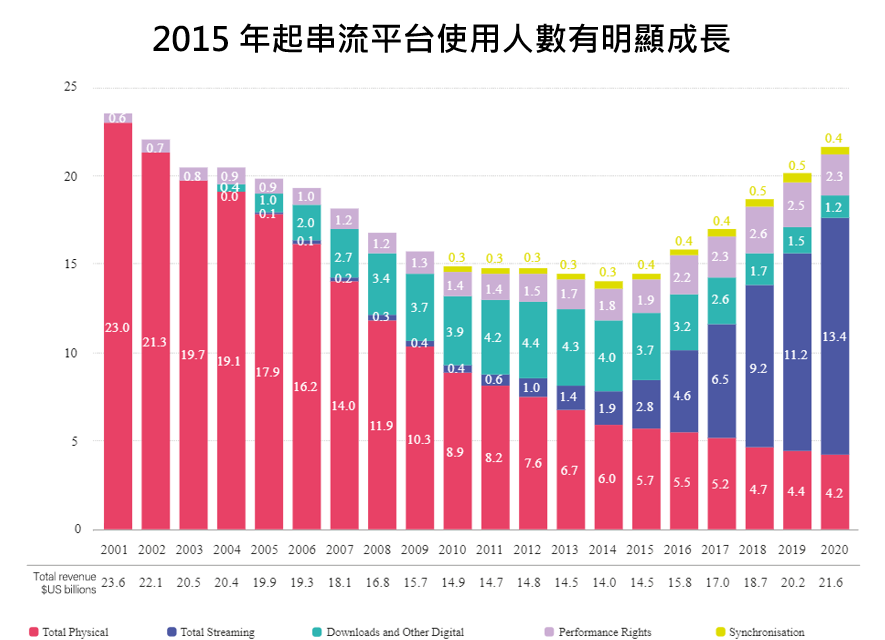 根據國際唱片業協會(International Federation of the Phonographic Industry) 2020 年調查報告中顯示,全球音樂聽眾中超過九成透過串流音樂平台聆聽音樂,付費訂閱佔整體產業收入比例也比 2019 年增加 18.5%。以上證明了自 2015 年起,串流平台憑藉著豐富的曲庫、便捷的使用者體驗,逐漸主宰整個音樂市場。