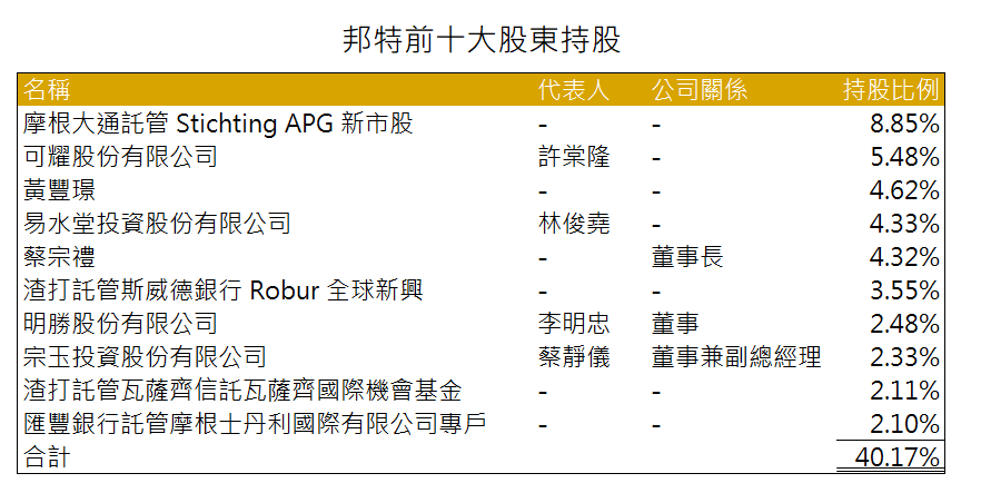 邦特董事透過直接和間接持股比僅 15%,持股比低。但值得關注的是 2021 年可成(市:2474)透過旗下子公司可耀持有 5.48% 股權,為可成切入醫材領域的長期投資計畫,因此此部分股權較穩定,而研究團隊認為可成不排除將繼續購買邦特股份的可能性。