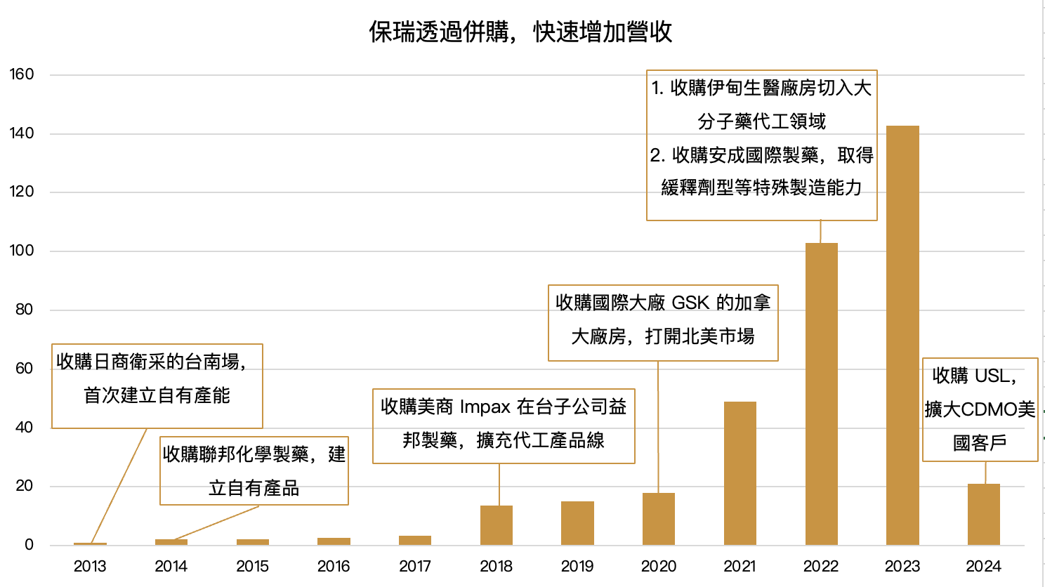 保瑞過去 10 年透過精準的策略併購,帶動營收成長,自 2013 年保瑞陸續併購聯邦製藥、美商益邦製藥、GSK 加拿大廠、伊甸生醫、安成國際等 6 個藥廠,營收從 2013 年的 0.92 億元新台幣(以下同) ,來到 2023 年的 142 億元。