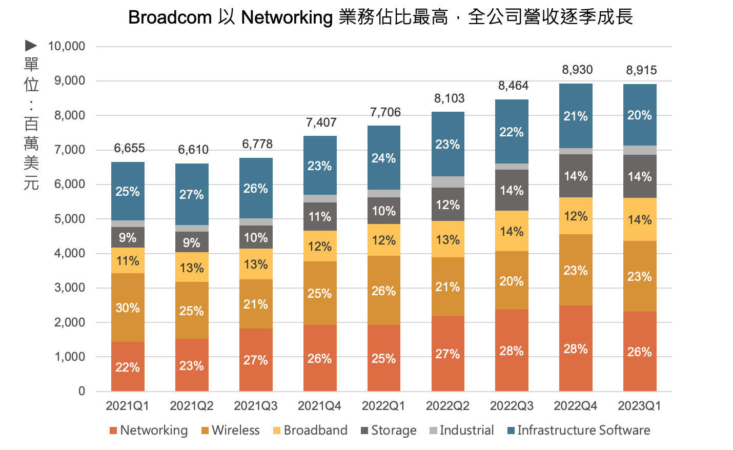 由上圖可見,Braodcom 公司營收組成分散,近年來更積極併購產業鏈上相關的軟體公司,有效擴大公司規模,過去幾年整併成效尚佳,營收逐年成長。