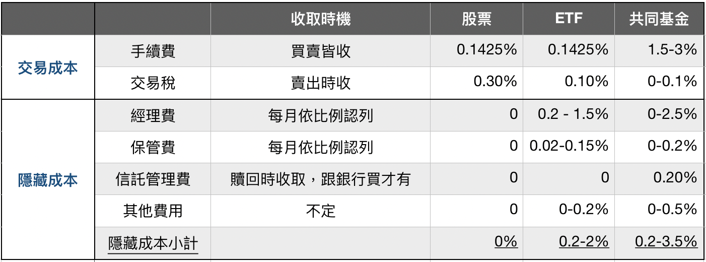 首先,在進入市場之前,我們「至少」必需知道在交易(或持有)這些不同的投資商品上,我們要付出多少的成本,先把成本拆分成發生在交易時的交易成本,如交易手續費和交易稅,還有商品本身內含的隱藏成本,例如管理費、保管費、所得稅、信託費等,注意,我們這邊是以「台灣」市場來分析成本差異。