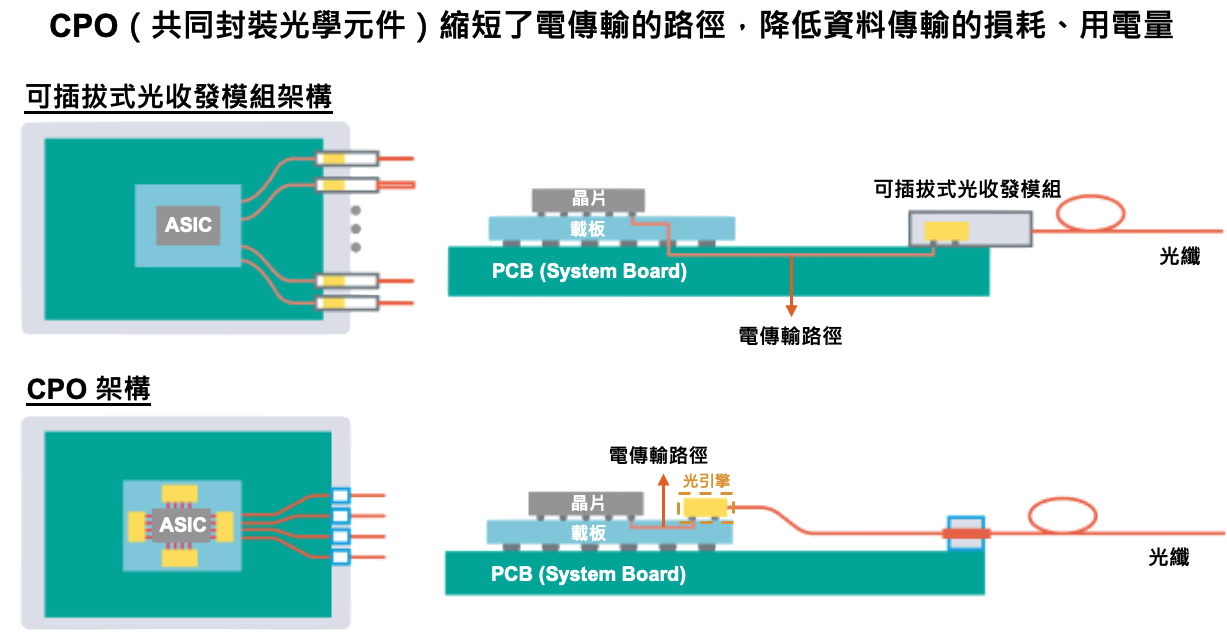 而 CPO 使用矽光子(Silicon Photonics,即透過矽作為光的傳輸媒介),將傳統光收發模組中的光通訊元件與交換器晶片整合、封裝在同一個封裝模組中(即光引擎),並安裝在同一個 Socket(插槽)上,減少了資料的傳輸路徑,在維持高傳輸速度下降低了功耗並減少訊號耗損或延遲。