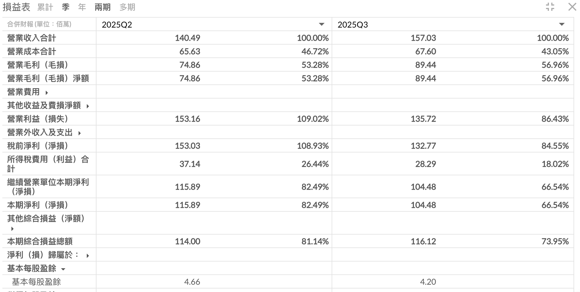 2025 年前三季營運表現強勁:公司 2025 年前三季累計營收達 4.24 億元,年增 32.4%。每股盈餘 (EPS) 為 11.58 元,已超越 2024 全年度的 9.51 元。毛利率持續提升,至第三季單季已達 57%。