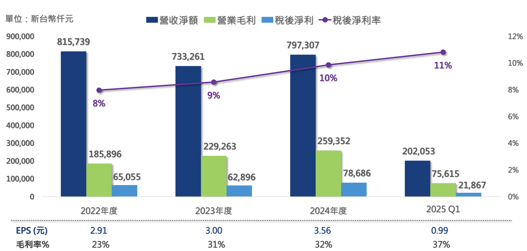 2025Q1 營收與毛利率雙雙創高,全年營收成長目標鎖定 25%~30%。