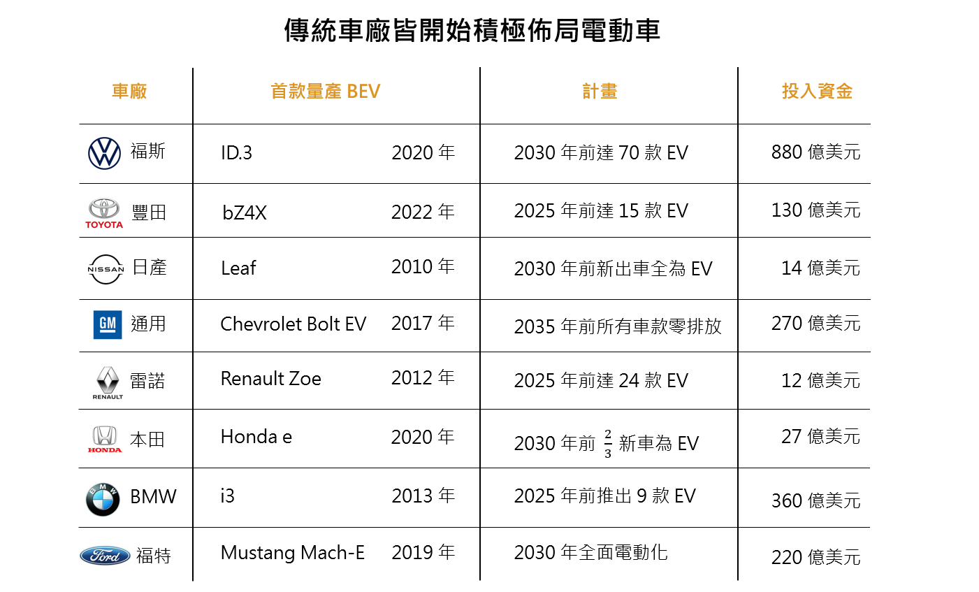 除了特斯拉、蔚來、小鵬等純電動車廠外,目前傳統車廠如福斯、BMW、甚至是油電車龍頭日本車廠豐田、本田等等,也都陸續在近年推出新的電動車款,也有給出未來旗下將有多少款電動車的願景,由此可見各大傳統車廠皆有所準備來因應電動車普及的趨勢。