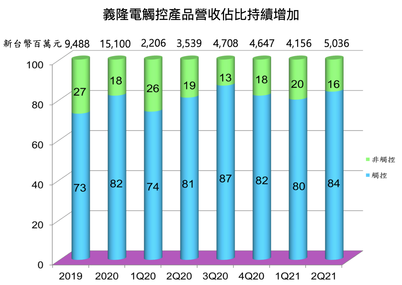 1. 義隆電 2021Q2 營運佔比分別為:觸控 IC 84%,包括觸控板 IC(Touch Pad)佔 51%、觸控螢幕 IC(Touch Screen)佔 20%、指紋 IC 佔 13%;而非觸控 IC 佔比為 16%,包括指向裝置(Point Stick) 9%、MCU 5%、關聯企業 2%,整體營運仍以 NB 觸控 IC 為主。