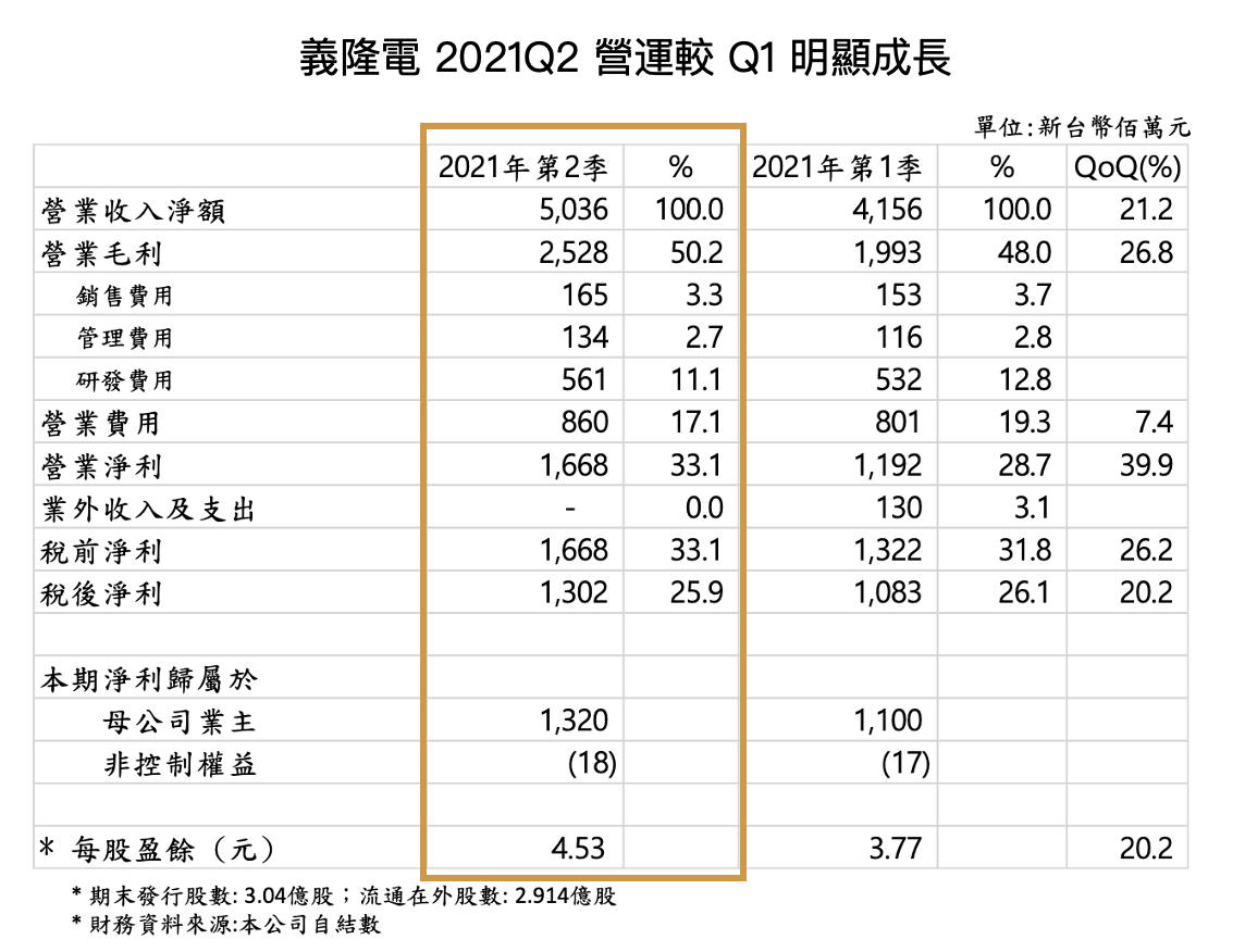 1. 義隆電 2021Q2 營收為 50.4 億元,YoY+42.3%,QoQ+21.2%,毛利率 50.2%,YoY+2.6ppts,QoQ+2.2%,主要受惠於漲價使得 ASP(平均售價)提升,稅後淨利 13.0 億元,YoY+45.8%,QoQ+20.2%,EPS 為 4.53元,YoY+1.42 元,QoQ+0.76 元,2021 上半年 EPS 累計達 8.3 元,YoY+4.97 元,整體成長強勁。