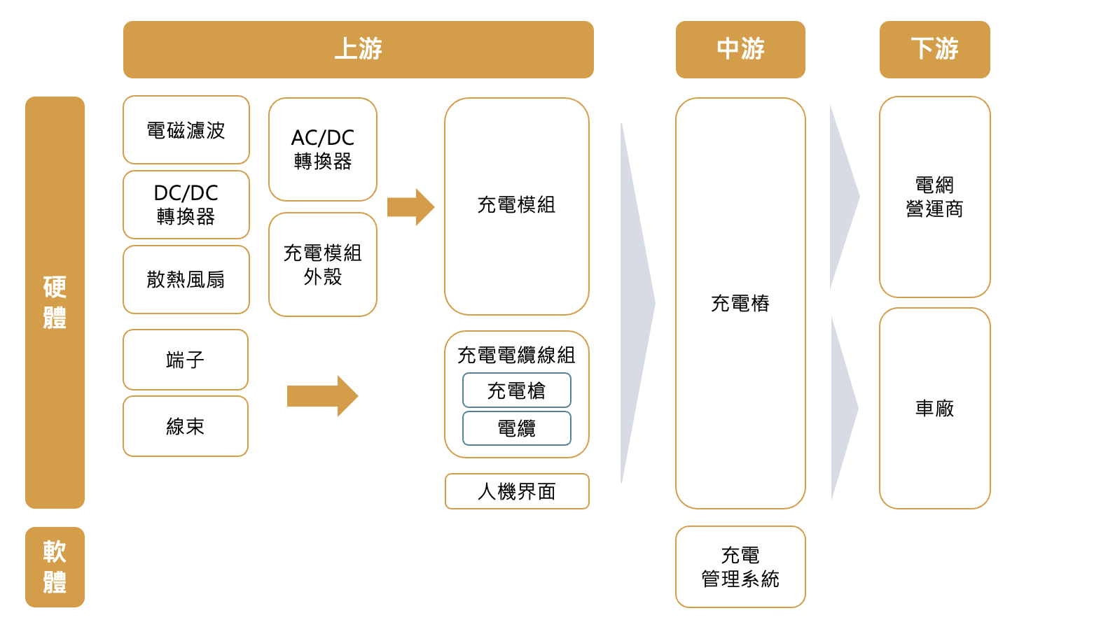 過去公共充電樁以交流慢充為主,未來則因消費者里程焦慮、各國補助轉變為直流快充,其中以充電模組(內含半導體)、充電電纜和充電槍為主要改革,以下將分析三大轉換重點與成長潛力。