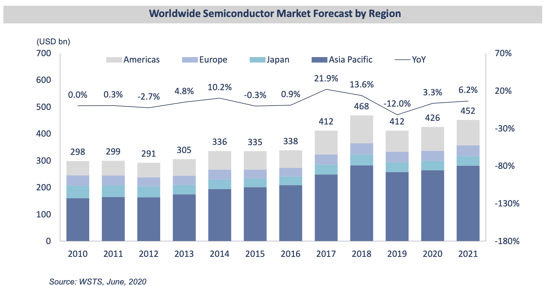 2.預估全球半導體市場在 2020 年將有 YoY+3.3% 的成長。支撐半導體在疫情中逆勢成長的原因主要是 WFH(遠端辦公)、遠距教學、 Cloud 帶動的成長(主要為記憶體)抵銷了消費性電子、智慧型手機的衰退。此外,預計 2021 年受惠於 5G、IoT、HPC 等遞延需求的來臨,整個半導體產業將有 YoY+6.2% 的成長表現。