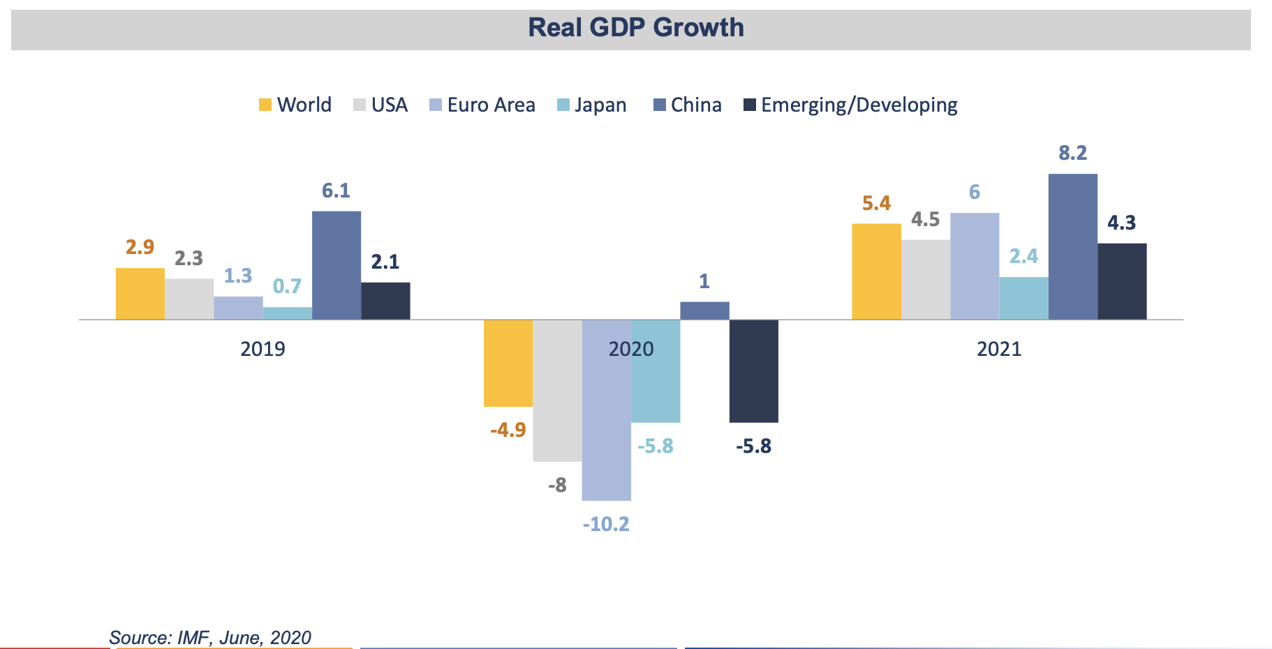 1. IMF(國際貨幣基金組織)預估因疫情衝擊, 2020 年幾乎全球的 GDP 都會衰退至負成長。而從目前各國公布的 2020Q2 GDP 表現來看,也印證了 2020 年是個不好熬的一年(美國 2020Q2 GDP QoQ-32.9%、歐元區 2020Q2 GDP QoQ-12.1%)。不過,IMF 同時也預估若疫情趨緩,各國經濟在 2021 年有爆發性的反彈。