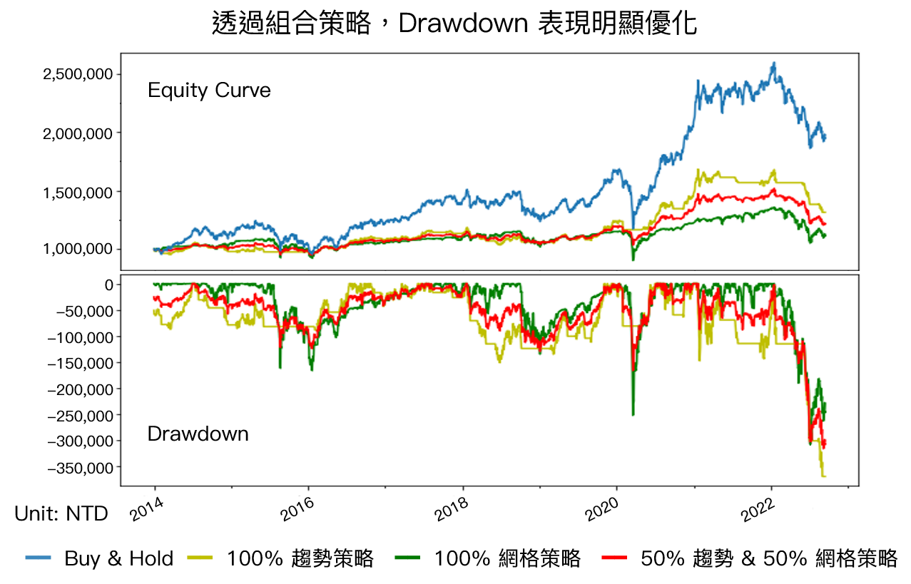 若我們截長補短(網格能夠在盤整行情獲利,但無法掌握上漲趨勢),與上篇文章所使用的趨勢策略結合,形成一個雙策略組合並各以 50 萬進行交易,再來看看組合績效表現。