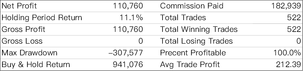 策略報酬率為 11.1%,績效仍遠不如買入持有策略,且於 2022 年初時出現總資產超過 30 萬的大回檔。而另一個可特別注意的點是交易次數高達 552 次,造成需共付出高達 182,939 元的佣金,已經超過我們的總報酬,顯示這樣頻繁交易的策略有很大部分的獲利會被交易成本所侵蝕。