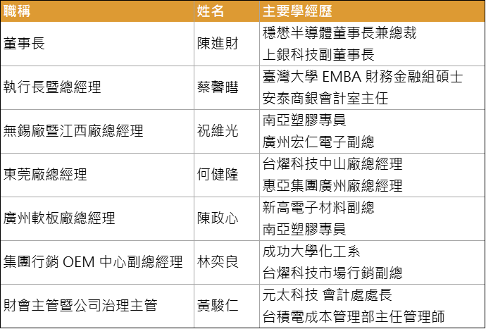 陳進財先生自 2019 年 7 月起擔任董事長,過去曾成功帶領穩懋(櫃:3105)轉虧為盈,並成功打進蘋果供應鏈,製造業管理經驗十分豐富。