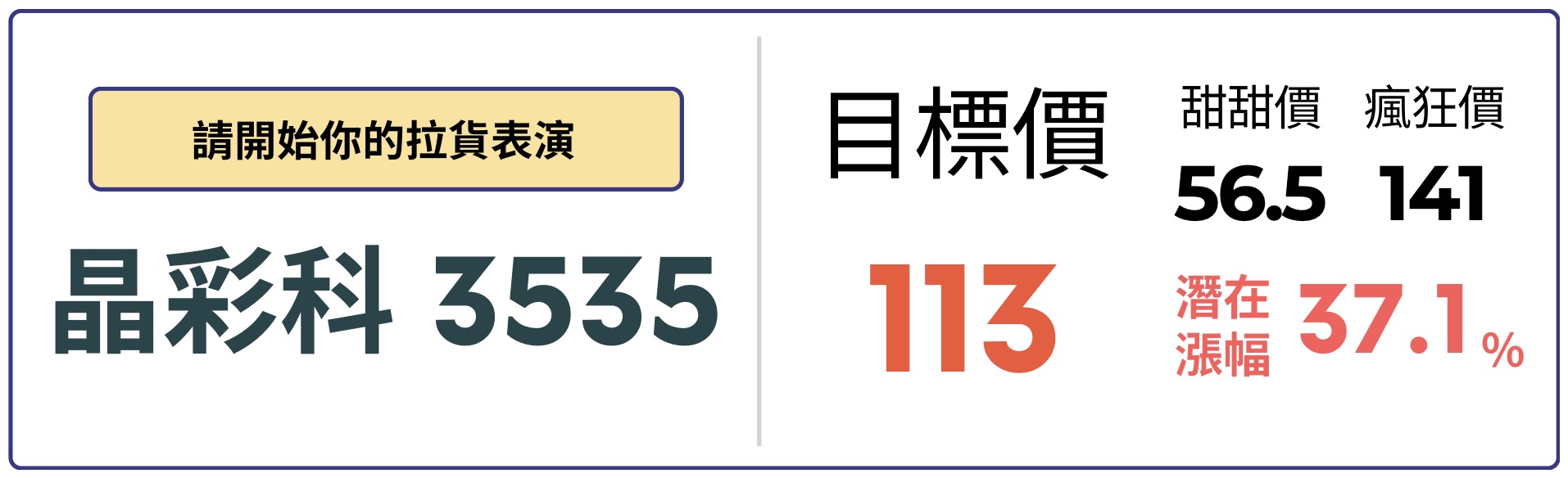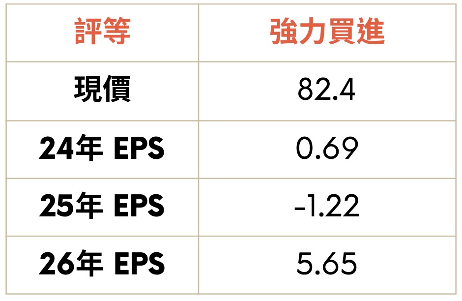 26 年預估出貨 68~80 台,YoY 高達 566%,光台積電機台,就可貢獻晶彩科 EPS 至少 5 元,產業整體評價落於 15~20 倍,晶彩科目前處於評價下緣,具備評價上修的空間。預估 26 年 EPS 達 5.65 元,將虧轉盈,給予合理本益比 20 倍,目標價 113 元,給予強力買進。