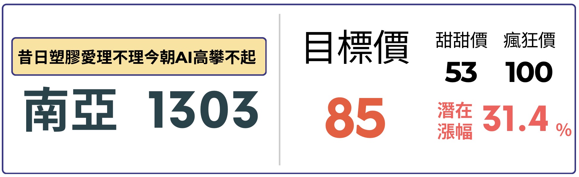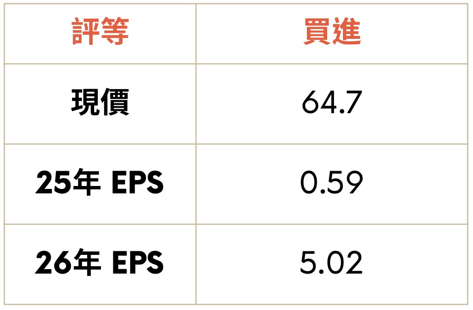 隨高階 AI 伺服器帶動 PCB 與記憶體漲價循環動能,南亞自身產業集銅箔、CCL、玻纖布於一身大大受惠,加上投資事業南亞科與南電將挹注顯著獲利,使得南亞將撕下以往台塑四寶標籤,正式帶上電子產業的光環。預估 2026 全年營收可來到 2,770 億元,年營收成長 6.6%,EPS 達 5.02 元,我們參考 PCB 族群區間本益比 (15-20X) 給予區間 17 倍評價,目標價 85 元。