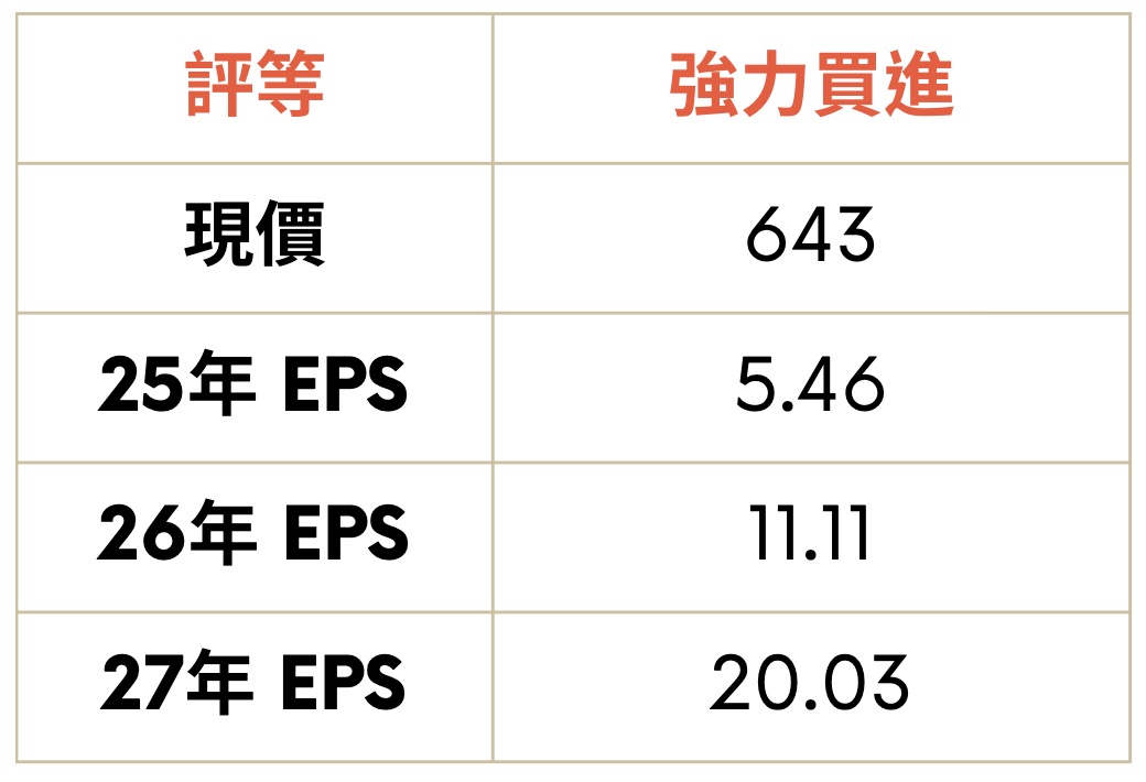 隨著全球兩大低軌衛星營運商 SpaceX 和 Amazon 的發射時程已排至 2030 年,且發射數量逐年增加,預期今年將是整個產業的爆發元年,公司衛星產品營收比重約佔 5 成,目前訂單較去年同期接近翻倍成長,且具備強大競爭優勢,屬於市場龍頭角色,預期 2026 及 2027 業績都將迎來高成長,參考市場普遍給予另一家產業龍頭昇達科的本益比約 40-50 倍,評價以 27 年 EPS 為依據,給予中間值 45 倍 PE,目標價 901 元,給予強力買進評等。