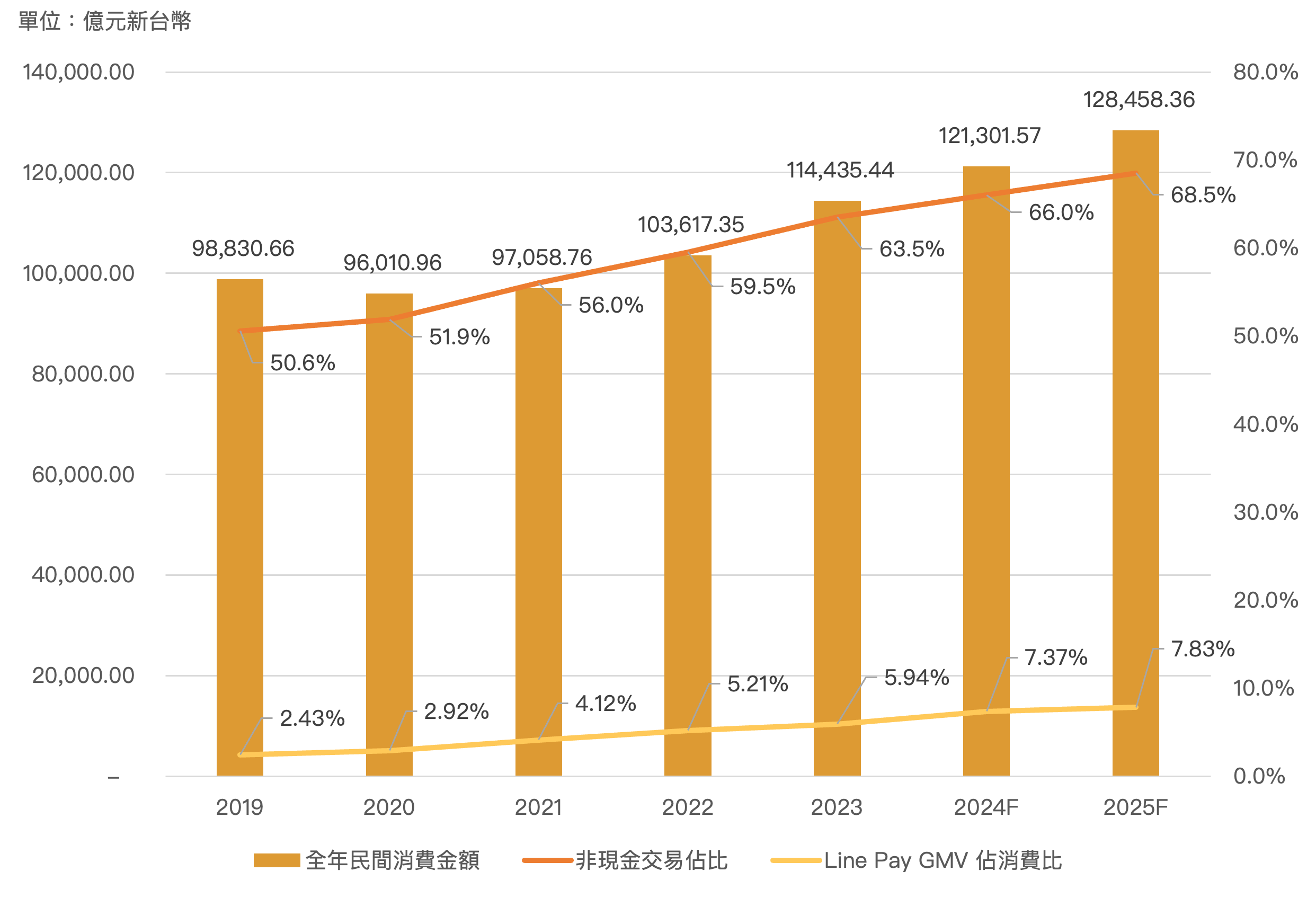 台灣本土市場,台灣非現金支付自 2019 年 50.59% 提升至 2023 年 63.53%,其中 LINE Pay 2023 年 GMV 約 6,810 億元,僅佔整體民間交易金額比例約 5.94%,仍有潛在成長空間。