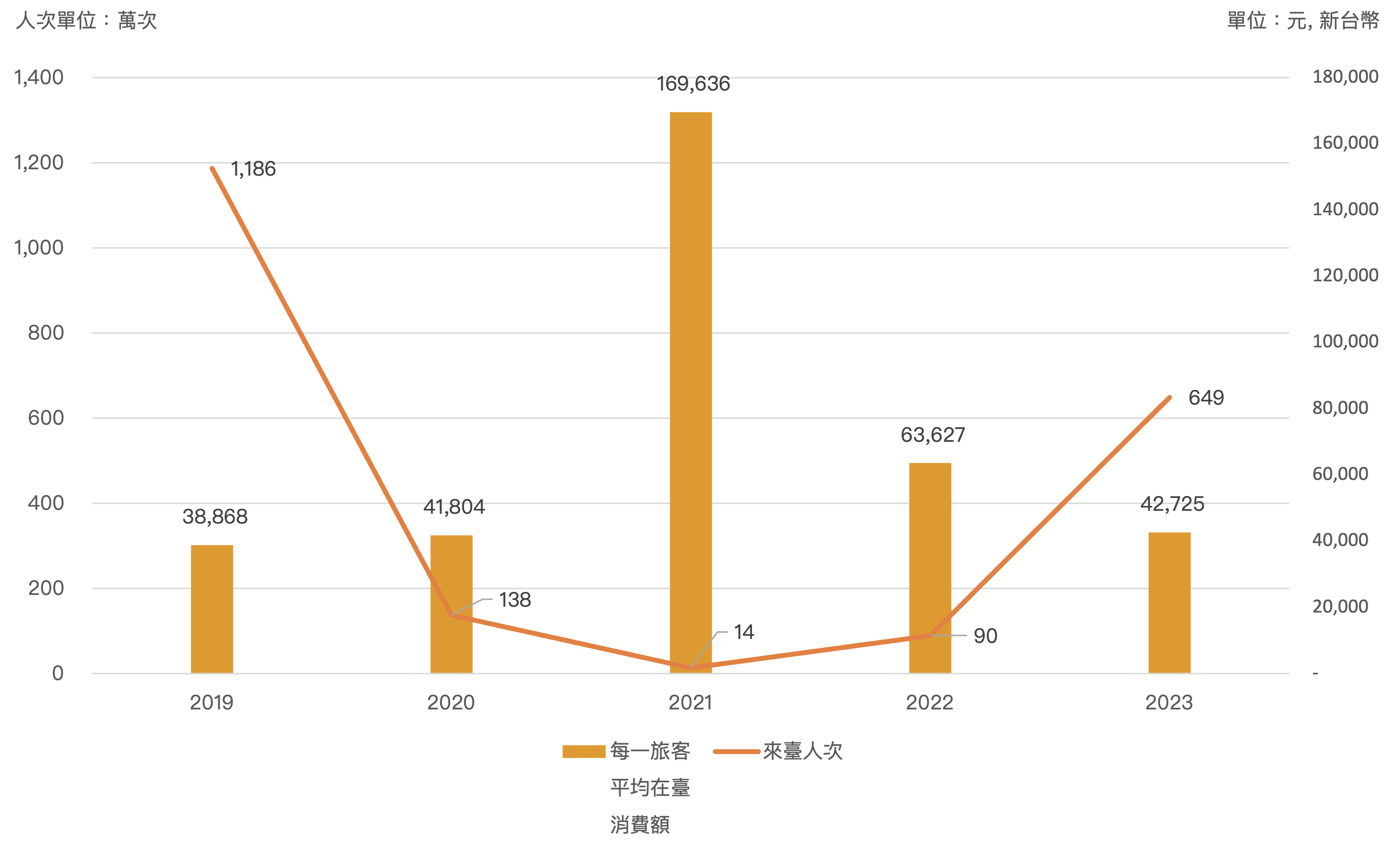 (註:富果認為 2021 年旅客消費額高於其他年次,係因疫情時來台旅客成分多以商務人士為主)
