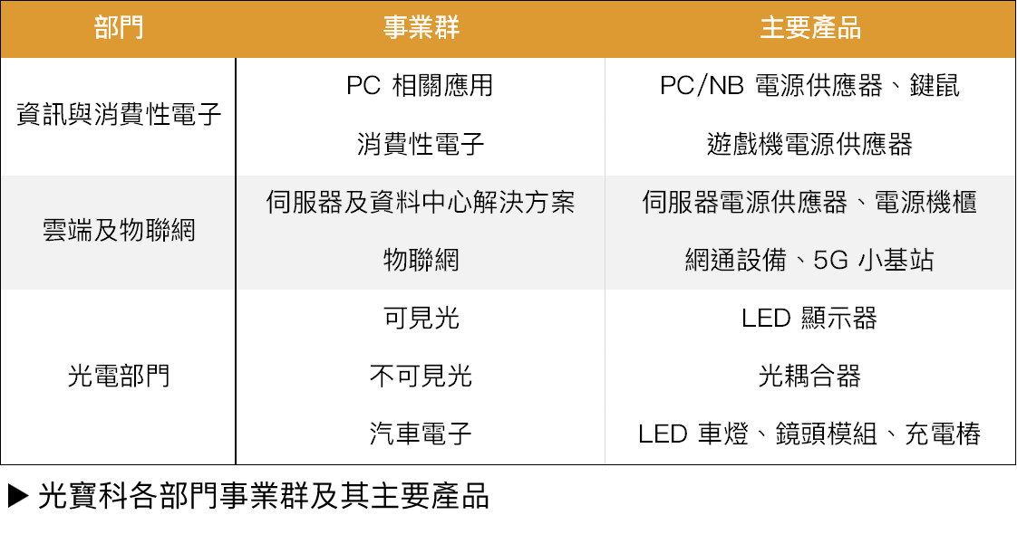 光寶科(市:2301)成立於 1989 年,公司業務切分為三大部門:資訊與消費性電子(PC/NB 週邊/電源供應器(以下簡稱「電供」)、遊戲機電供)、雲端及物聯網(伺服器電供、資料中心電源機櫃、網通設備)、光電(LED 顯示器、車用電子等),2022 年營收占比為 47%、33%、20%。