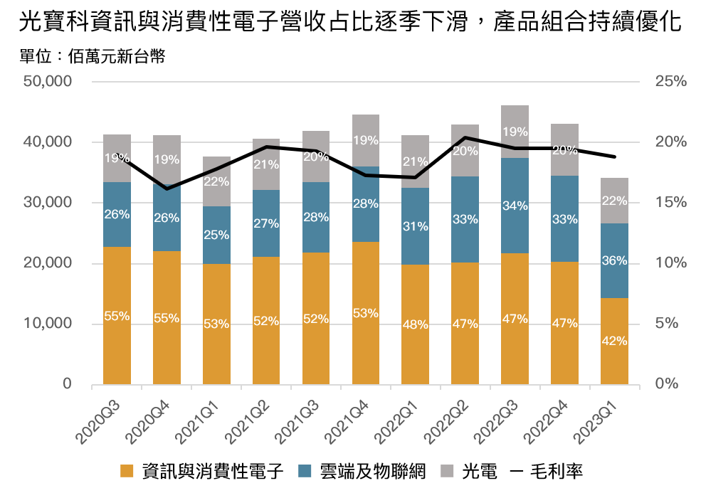 公司近年來資訊與消費性電子營收占比逐季降低,自 2020Q2 之 58% 下滑至 2023Q1 之 42%,透過優化產品組合,帶動公司毛利率成長。
