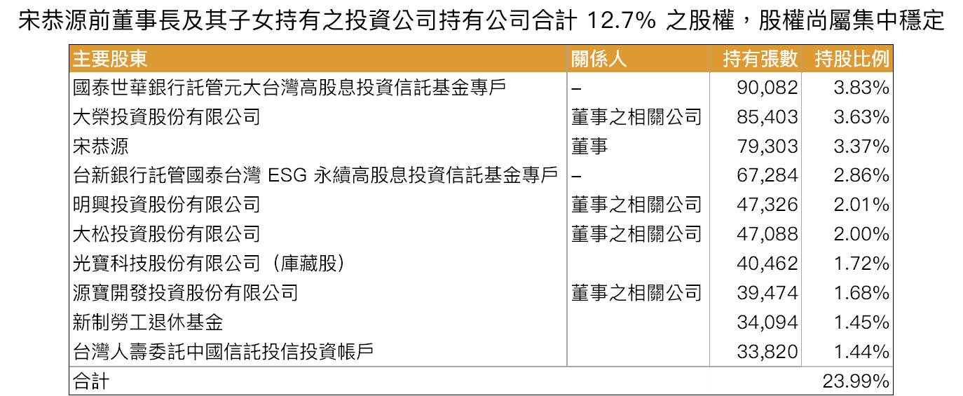 股權部分,宋恭源前董事長及其子女持有之投資公司(大榮、明興、大松、源寶投資)持有 12.7% 之股權,此占比近 10 年無明顯變動。其餘大股東多為基金持股,前十大股東占比達 24%,股權尚屬集中穩定。