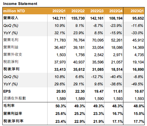 預計 2023Q2 營收為 918~995 億元(匯率為美元兌新台幣 1:30.3),YoY-36~-41%,QoQ-2~+26%;毛利率預估為 45.5~48.5%,QoQ-2.5~+0.5ppts;營業費用率為 31~35%。