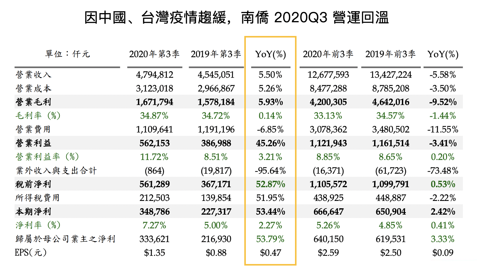 1.南僑 2020Q3 營收為 47.95 億元,YoY+5.50%,QoQ+12.44%。2020 年累計前 10 個月營收為 141.78 億元,YoY-5.09%,造成衰退主要由於 2020 上半年受疫情影響所致。