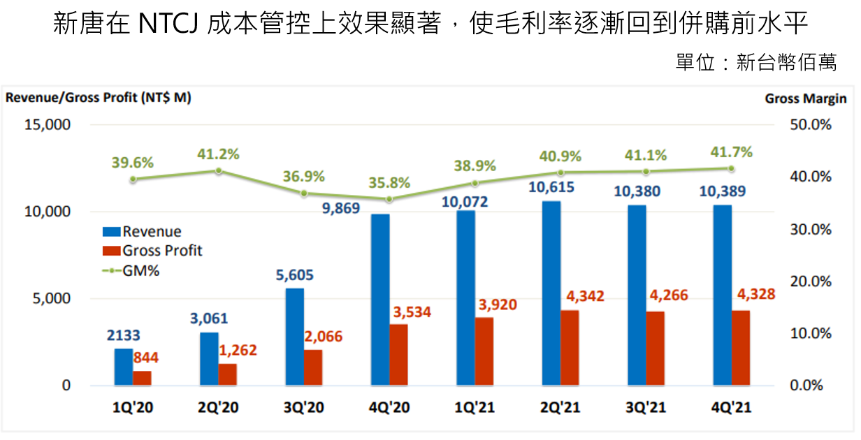 營利率達 11.7%,YoY+11.3ppts,QoQ+3.8ppts,稅後淨利達 10.9 億元,YoY+1457.1%,QoQ+69.6%,EPS 為 2.64 元,YoY+2.44元,QoQ+1.08 元。公司稅後淨利較 Q3 明顯成長主要來自 NTCJ 營運優化(管理費用有持續減少趨勢,預計與 NTCJ 人事成本持續精簡有關)及年底調整相關費用帶動營利率明顯上升所致。