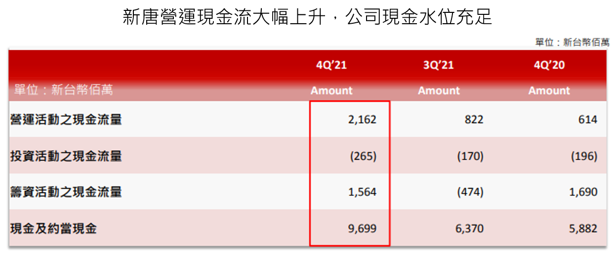 3. 新唐 2021Q4 營運現金流為 21.6 億元,較前幾季十分顯著的增加,主因來自 Q4 營運表現亮眼,使帳上現金達到 97 億元,整體現金流和現金水位狀況健康,針對先前欲併購 NTCJ 所進行的借款目前無償還疑慮。