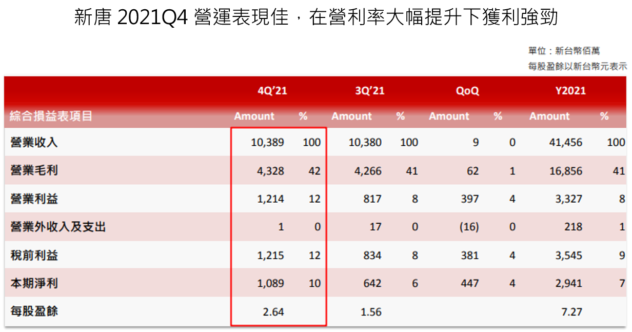 2. 新唐 2021 全年營收為 414.6 億元,YoY+100.6%,毛利率回升至過往水平 41.7%,YoY+3.4ppts,稅後淨利為 29.4 億元,EPS 為 7.27 元。