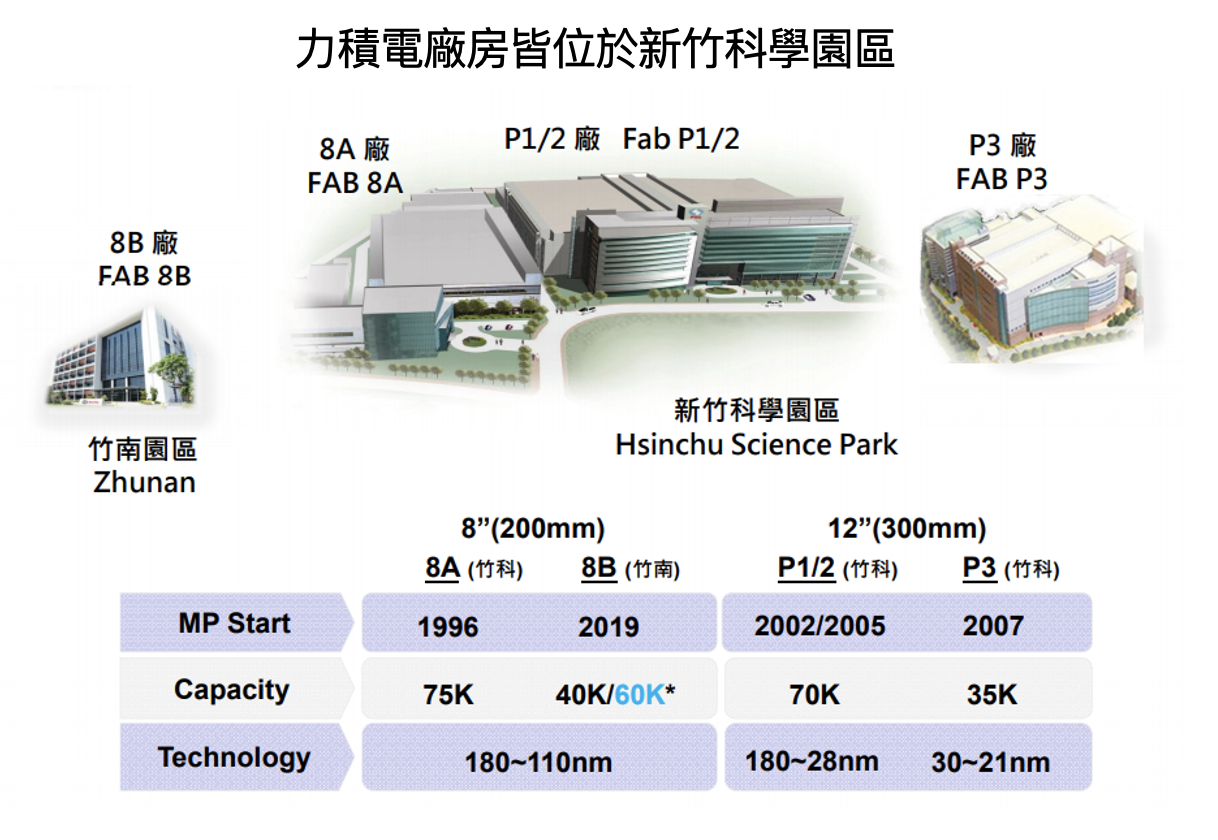 2. 力積電目前全產線產能利用率接近 100%。其中 12 吋產能為 10.4 萬片/月,邏輯 IC 佔 55%、DRAM 佔 45%,預計到 2021 年底 12 吋產能將增加至 11 萬片/月,製程以 28~180nm 為主;而 8 吋產能為 11.5 萬片/月,其中離散元件佔比 75%、其餘邏輯 IC 佔 25%,製程以 110~180nm 為主。預計公司 2021 年整體產能將不會有明顯增加。
