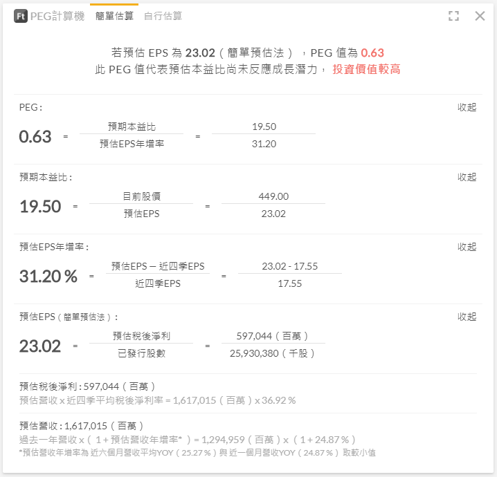 另外,怕麻煩、看到一堆數學就頭暈的朋友不用擔心!其實富果非常貼心免費提供了 PEG 計算器給大家,只要註冊後即可使用哦!