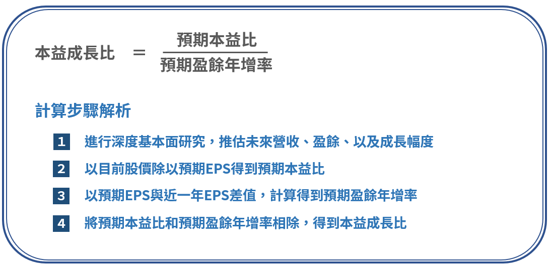 本益成長比綜合考量本益比和企業盈餘的成長性:當本益比越低(股價相對便宜)時,PEG越低、當企業盈餘成長動能越強時,PEG越低。因此彼得林區較喜歡買PEG低的股票。詳細計算方法請見下圖。