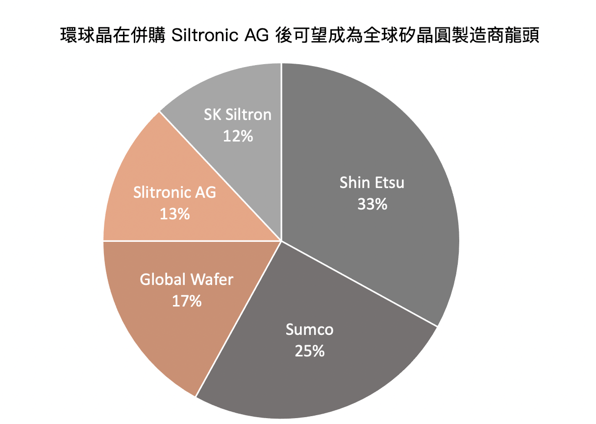而此次收購 Siltronic AG 後,環球晶市占率將預估可達約 30%,將一舉成為全球矽晶圓製造商龍頭,未來矽晶圓市場將越來越寡占,將由環球晶、日本的信越半導體(Shin Etsu)、勝高(Sumco)三國爭霸,三者合計市占率就高達 88%。