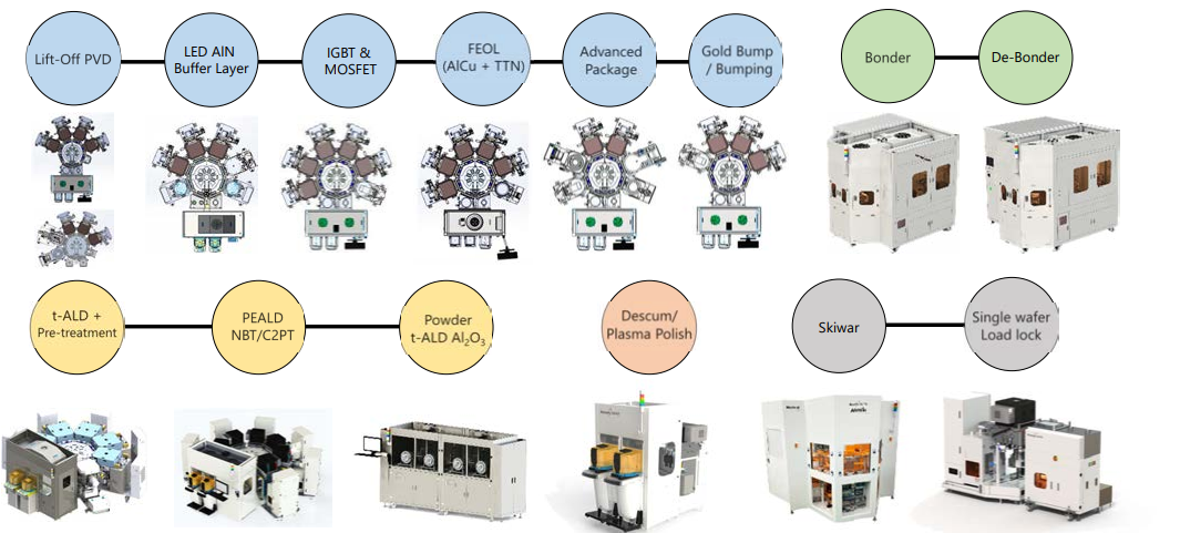 公司設備聚焦在半導體製程中的兩大主題:薄膜沉積及晶圓減薄,目前主要量產的設備有三大類:PVD(Physical Vapor Deposition,物理氣相沉積)、ALD(Atomic Layer Deposition,原子層沉積)、Bonder/De Bonder(鍵合/解鍵合),並在近年持續推出新設備,為台灣少數專注在晶圓製造前段製程設備的公司。