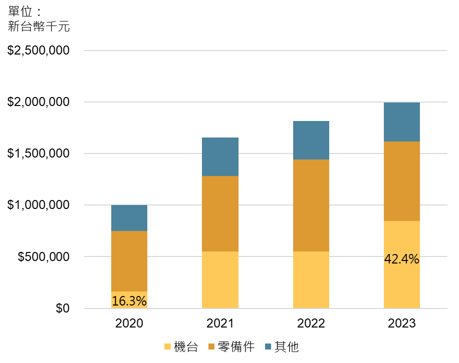 公司於 2017 年正式跨入半導體設備行業,初期以沉積設備為主,後來持續往鍵合設備、蝕刻設備發展,設備營收佔比也從 2020 年的 16.3% 成長到 2023 年的 42.4%,並於 2024 年超越零件佔比。