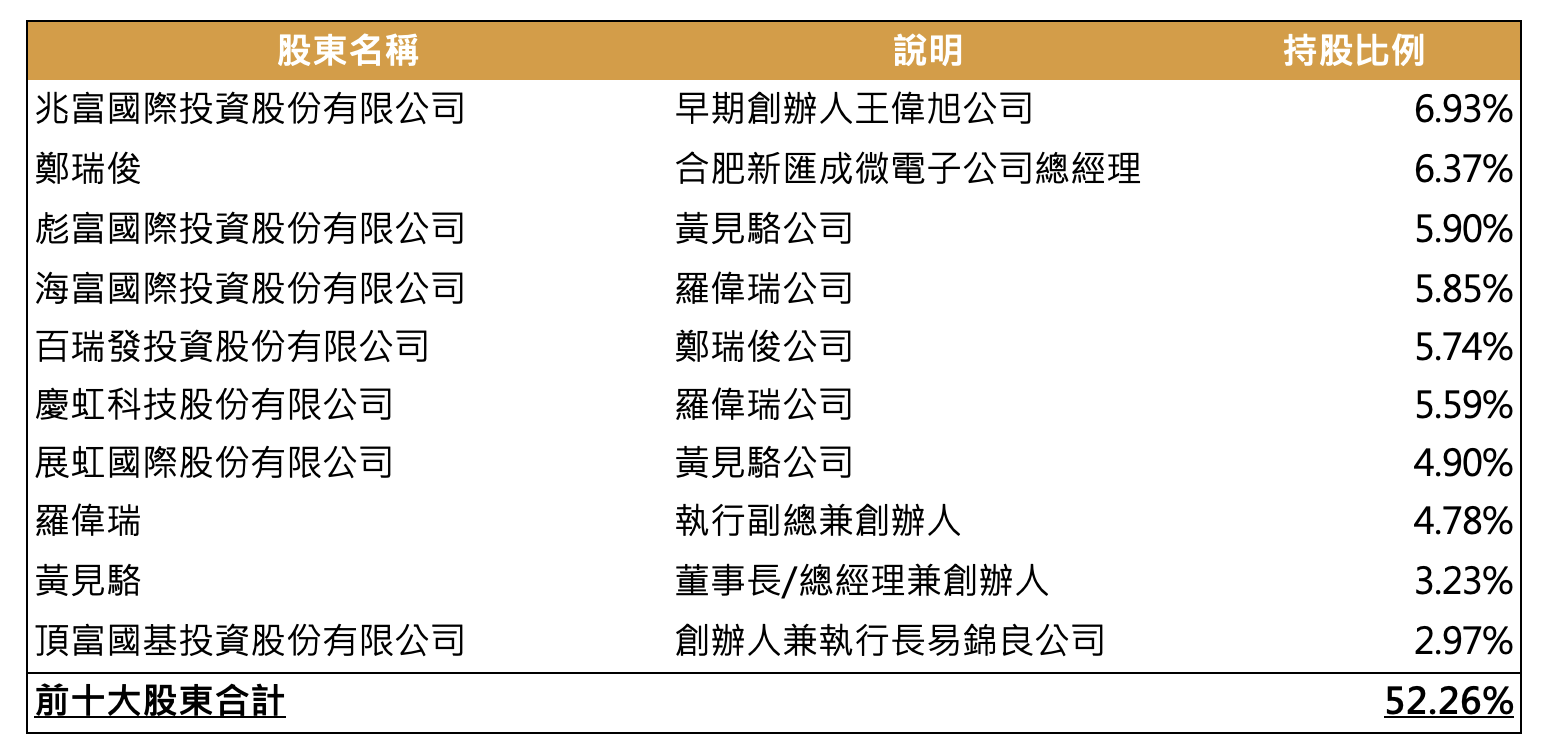而天虹另一大股東鄭瑞俊(台灣人,後於中國半導體創業)則持有 9.2% 股份,其為中國合肥新匯成微電子股份有限公司之總經理,為顯示、驅動 IC 之封測廠,推測為天虹合作之客戶。