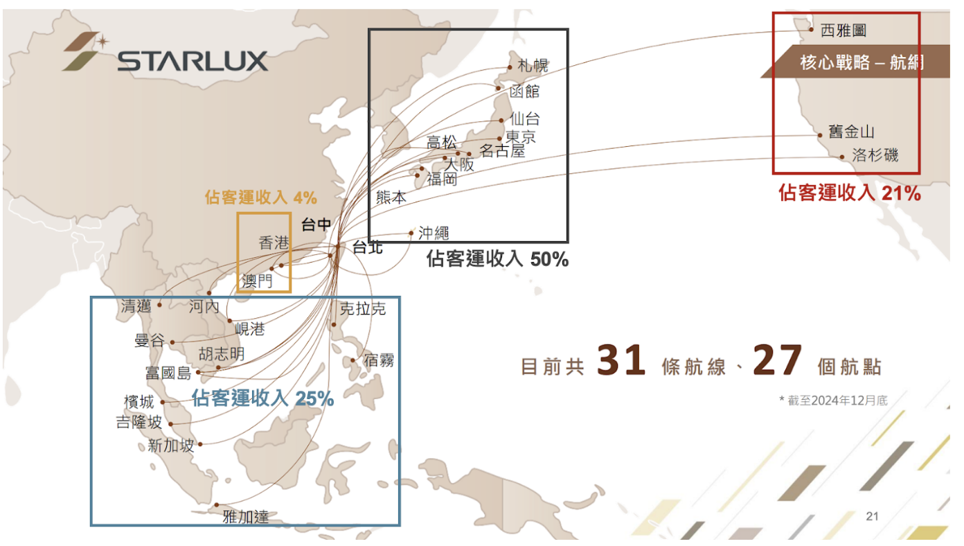 星宇在 2020 年首先佈局在台北-東南亞、台北-澳門、台北-日本等航線,並陸續增加東南亞、東北亞的航點,在 2023 年更插旗北美西岸的洛杉磯、舊金山航線,台北-西雅圖航線也於 2024/8 月開航。