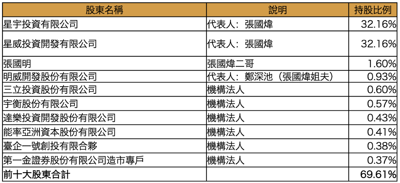 董事長張國煒持股 64.32%,張國明、鄭深池及其他機構法人持股皆不高於2%